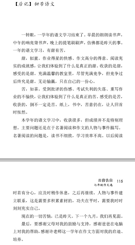 現(xiàn)在看到這本作文冊(cè),回想兒子一年的寫和改的經(jīng)歷,感覺付出沒有白費(fèi),值了。老公是個(gè)有心人,加了些圖片,寫了序,再讓兒子寫了后記,裝訂成冊(cè)。兒子看到后雖然沒有特別的表現(xiàn),我想他感觸應(yīng)該很深吧,對(duì)他來說這個(gè)過程更有意義。